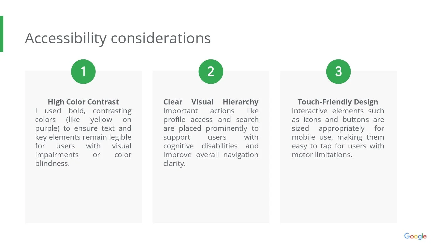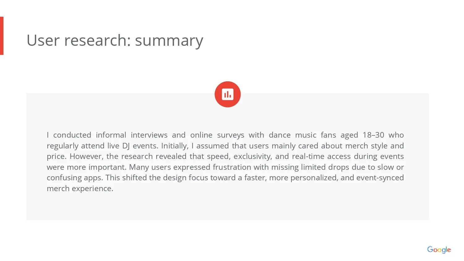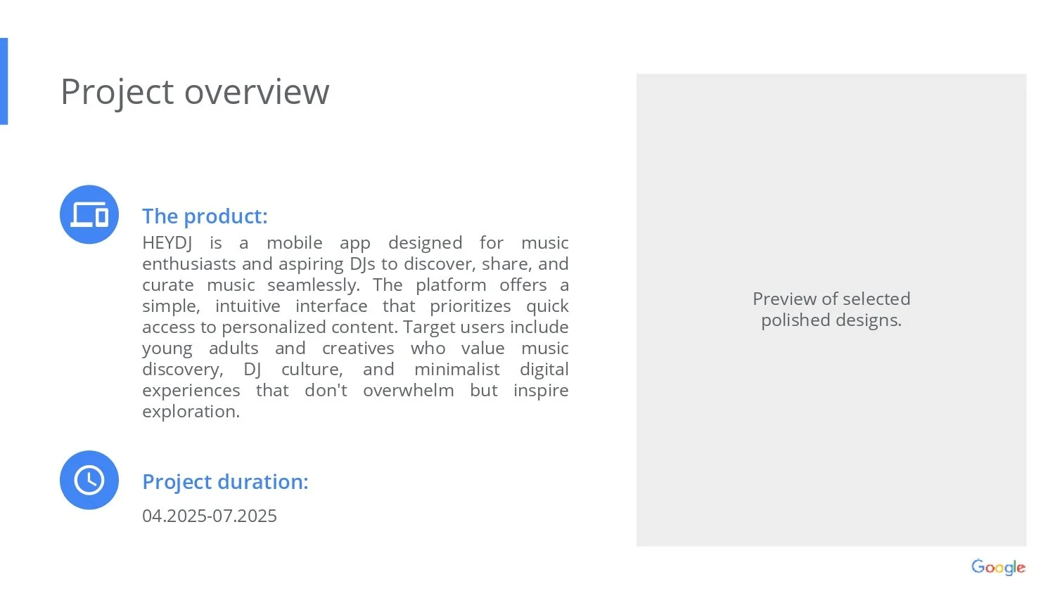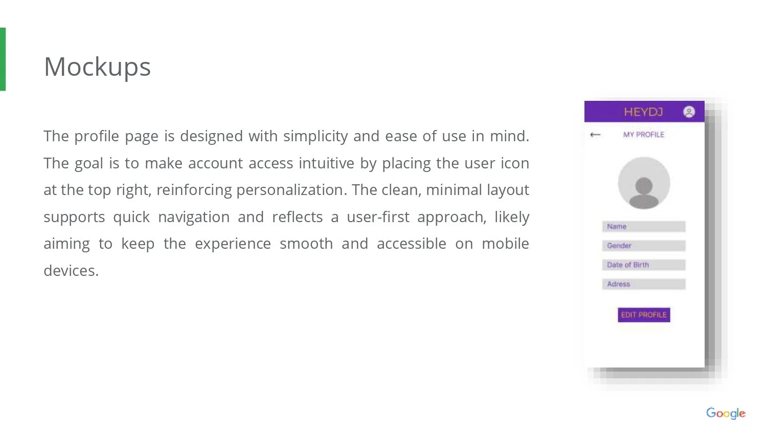 This project focused on designing HEYDJ, a mobile app for music enthusiasts and aspiring DJs. The goal was to create a clean, intuitive interface with a strong brand identity, prioritizing easy navigation through features like a prominent search bar and simple profile access. Accessibility was considered with high color contrast, clear hierarchy, and touch-friendly elements. As a course project, the design was well-received by peers, who highlighted its intuitive and user-friendly flow.